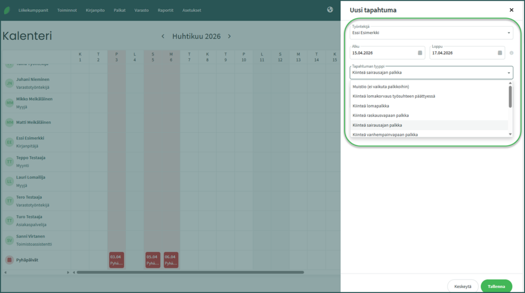 Tapahtuman tyypissä valitaan palkkalaji, jota käytetään palkanlaskennassa. Esimerkiksi sairausloma merkittäisiin kalenteriin tapahtumatyypillä ”Kiinteä sairausajan palkka”. Kun kyseessä on kiinteä palkka, käyttää ohjelma työntekijän tietoihin kyseiselle palkkalajille tallennettua palkkaa.