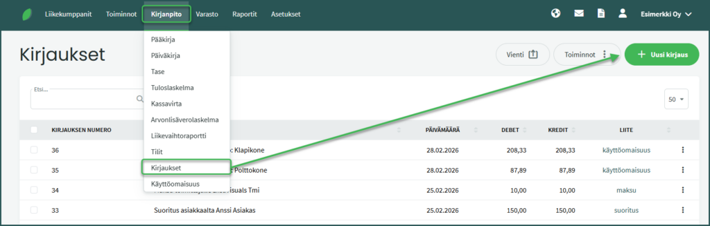 - Tee kirjanpidon kirjaus kohdasta Kirjanpito > Kirjaukset > Uusi kirjaus.
