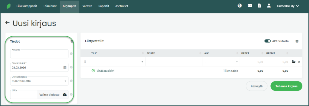 - Debet tai Kredit – Debet- ja kreditpuolen summien tulee olla yhtä suuret. Yhdelle riville kirjataan summa vain toiseen kenttään, joko debetiin tai kreditiin.