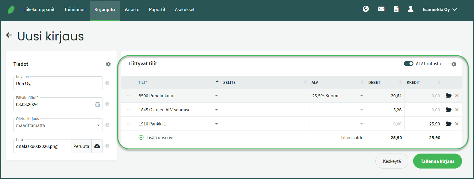 Kirjauksella on oletuksena yksi rivi. Kun täytät ensimmäisen rivin, ohjelma lisää uudelle riville automaattisesti jäljellä olevan summan. Valitse uudelle riville kirjanpidon tili, tarvittaessa ALV-kanta ja tarkista summa. Kirjauksella tulee olla vähintään kaksi riviä, ja debet- ja kreditpuolen summien on täsmättävä.