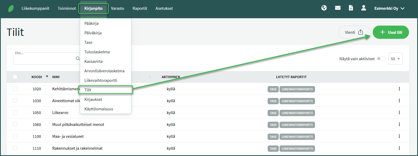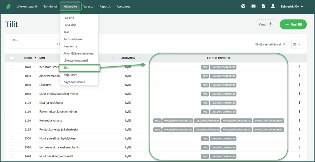 Huom: Varmista tilin lisäämisen jälkeen, että se on mukana taseella tai tuloslaskelmalla, sekä muilla tarvittavilla raporteilla. Tilit-sivulla tilin rivillä näkyvät siihen liitetyt raportit.