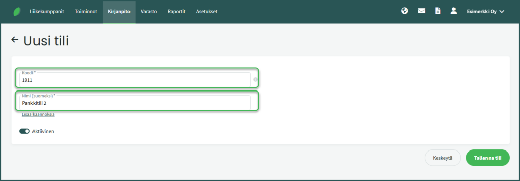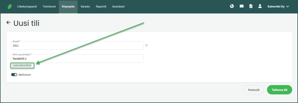 Jos haluat tulostaa raportteja englanniksi tai ruotsiksi, lisää myös käännökset tilin nimelle.