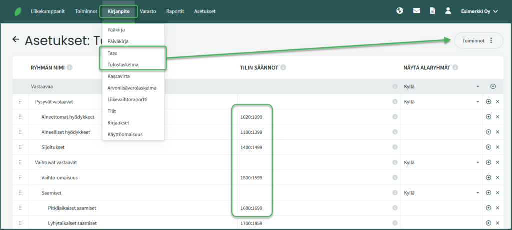 Näihin tiliväleihin lisätyt tilit tulevat automaattisesti mukaan raportille.