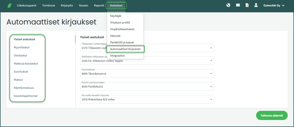 Huom: Jos poistat tilikartasta tilejä, varmista että tili ei ole ohjelman automaattisten kirjausten käytössä. Näet automaattisten kirjausten tilit kohdasta Asetukset > Automaattiset kirjaukset: