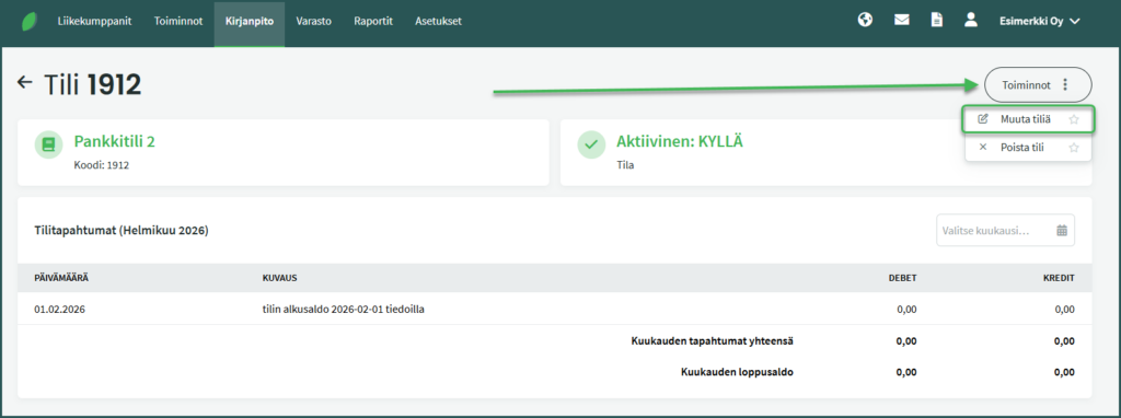 Tilin valitsemisen jälkeen näet avautuvassa näkymässä tilin saldon. Voit muokata tiliä napsauttamalla Toiminnot-valikosta ”Muuta tiliä”.