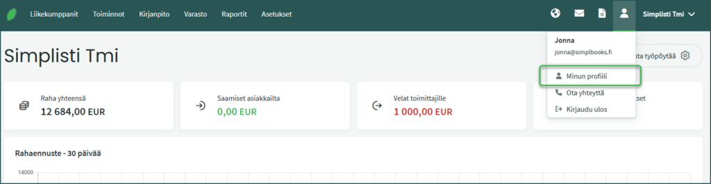 1. Valitse kirjautumisen jälkeen oikealta ylhäältä Minun profiili.