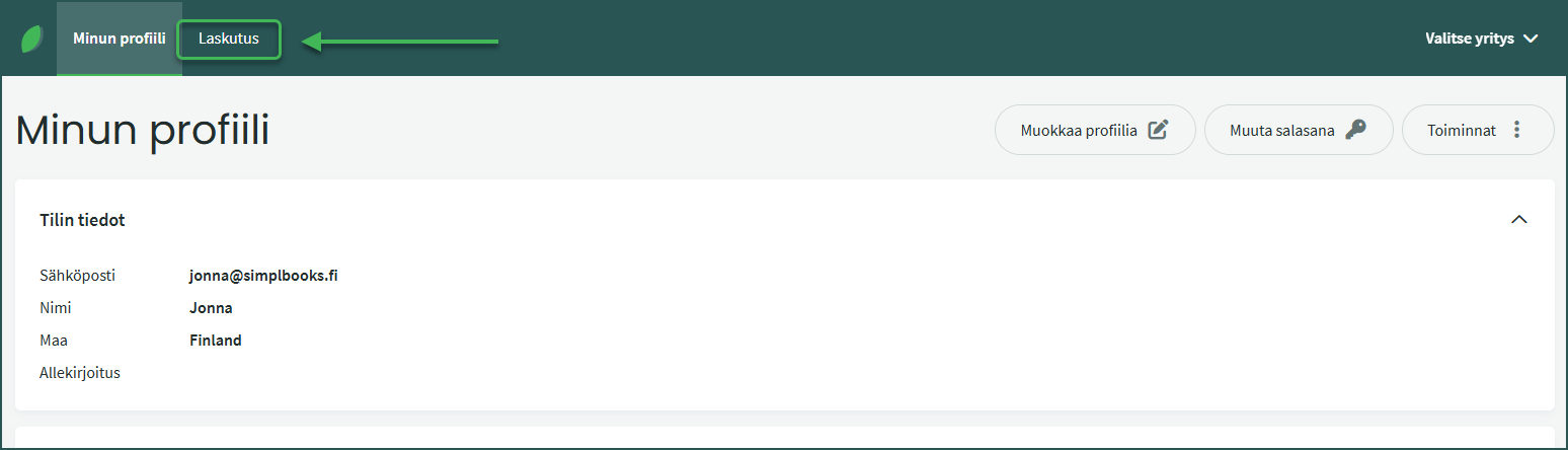 Laskutusprofiili määrittää, kenelle SimplBooks-palvelun laskut lähetetään. Kun perustat SimplBooks-käyttöympäristön, sinulle syntyy automaattisesti tyhjä laskutusprofiili, johon sinun tulee lisätä omat laskutustietosi. SimplBooks ei lähetä laskuja ennen laskutusprofiilin täyttämistä.