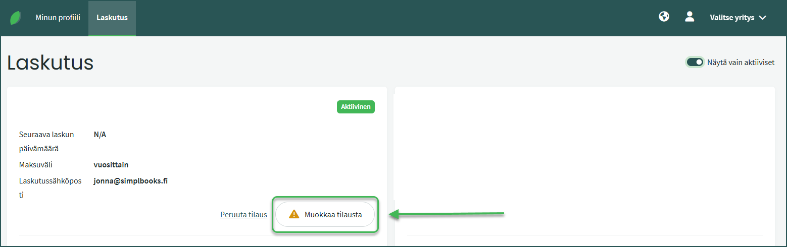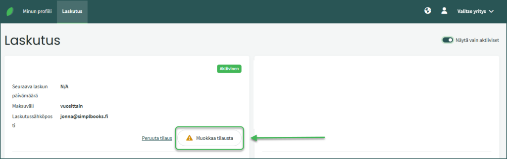 Laskutusprofiili on välttämätön, jos haluat jatkaa SimplBooks-palvelun käyttöä ilmaisen kokeilujakson jälkeen. Jos profiilia ei täytetä kokeilun aikana, käyttöympäristö sulkeutuu kokeilun päätyttyä. Mikäli et aio jatkaa SimplBooksin käyttöä, ilmoitathan siitä asiakaspalveluumme, jotta voimme poistaa käyttöympäristösi kokonaan.