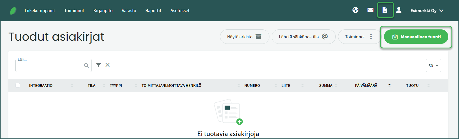 2. Voit myös tuoda verkkolaskuja manuaalisesti kohdasta Tuodut asiakirjat > Manuaalinen tuonti