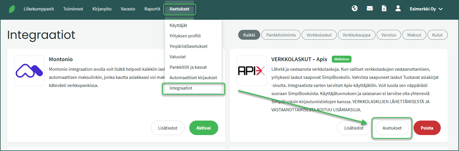 3. Voit asettaa ohjelman tallentamaan laskut automaattisesti kohdasta Asetukset > Integraatiot > Apix > Asetukset > Automaattinen tallennus.