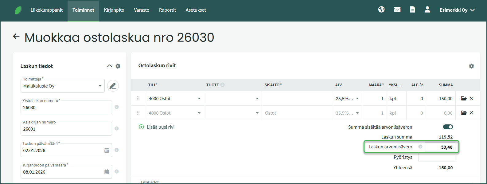 • Voit muuttaa arvonlisäveron määrää manuaalisesti muokkaamalla ostolaskua.