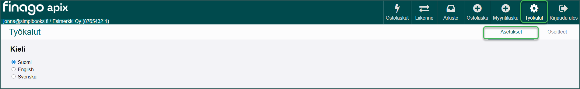 • Laskumappiin kirjaudutaan sähköpostiosoitteella ja salasanalla, jotka määritit ottaessasi Apix-integraation käyttöön SimplBooksissa.