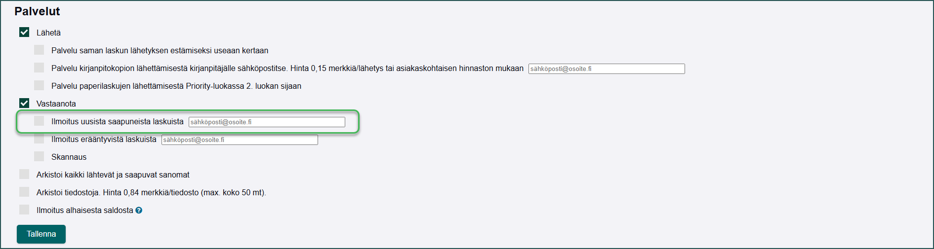 6. Voit halutessasi ottaa käyttöön sähköposti-ilmoituksen saapuneista verkkolaskuista.