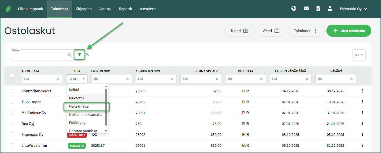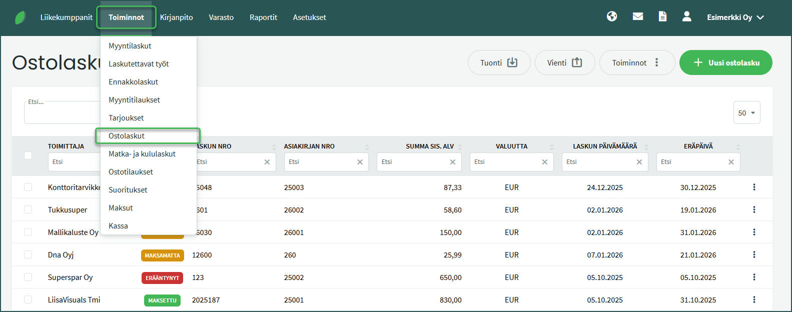 1. Ostolaskut merkitään maksetuksi kohdasta Toiminnot > Ostolaskut.