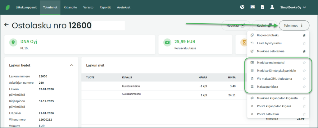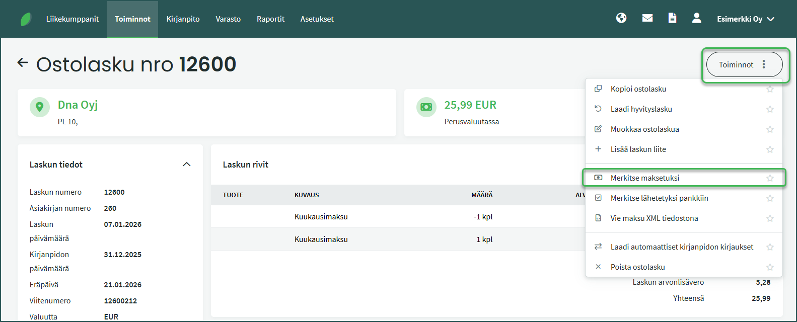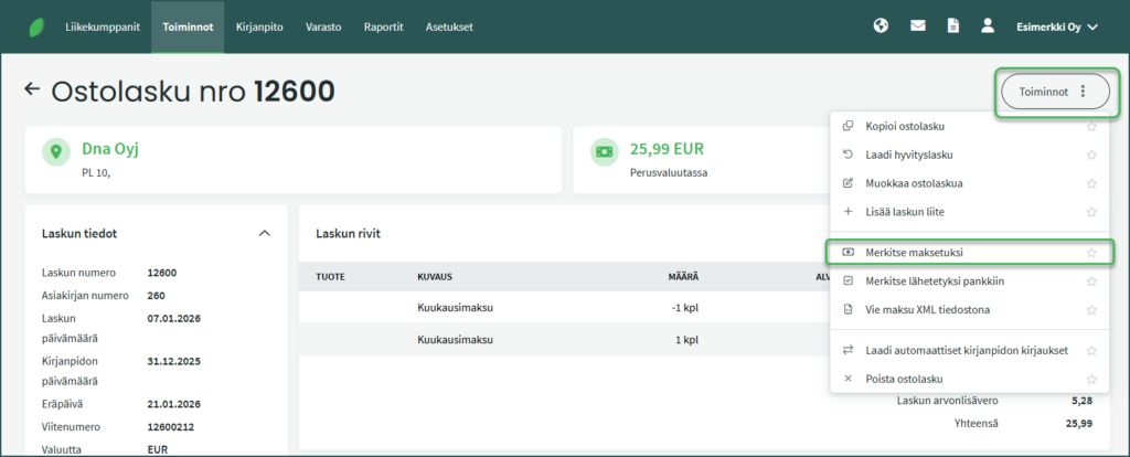 3. Kun olet avannut haluamasi ostolaskun, valitse Toiminnot-valikosta ”Merkitse maksetuksi”.