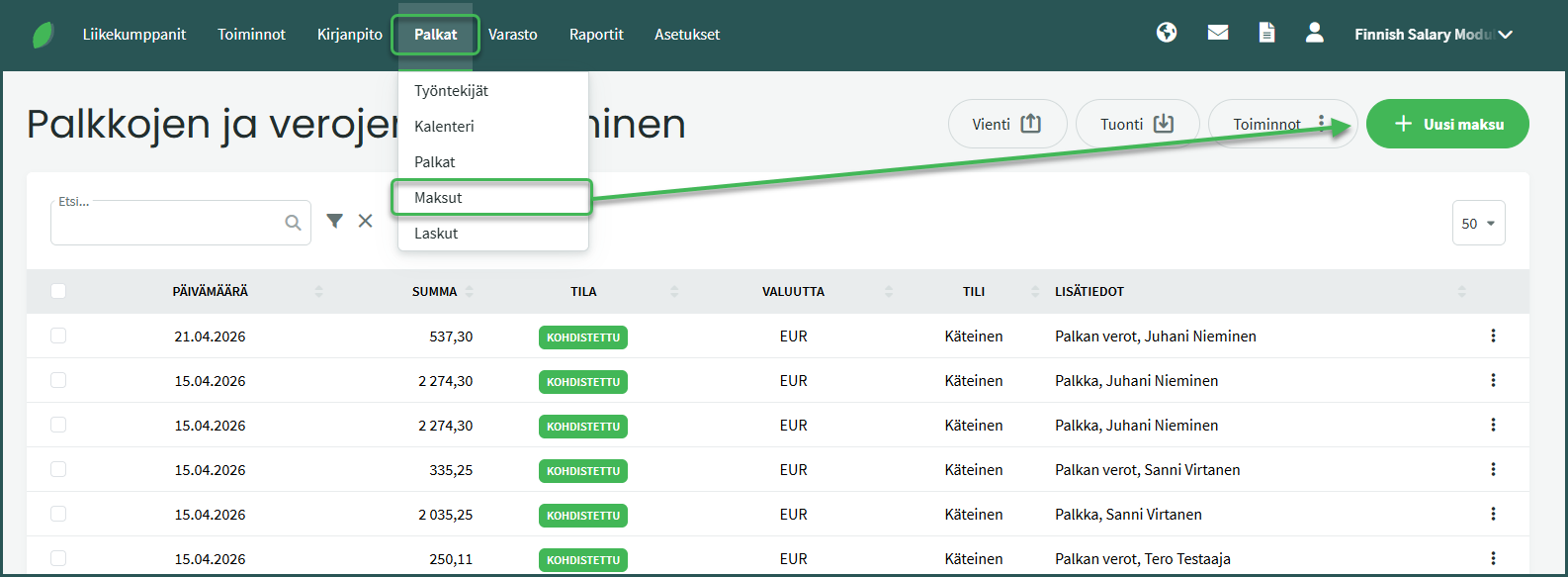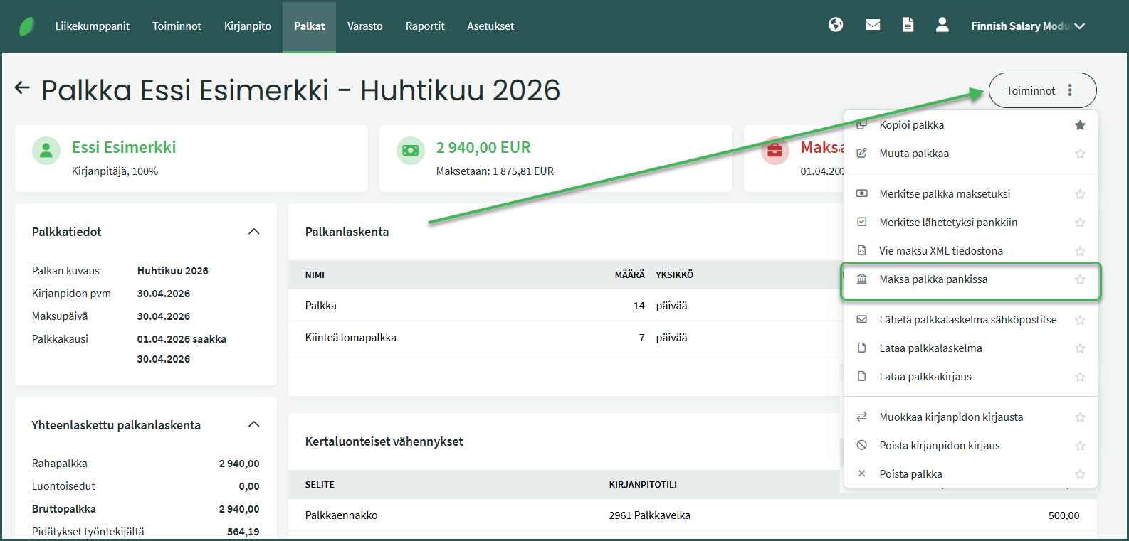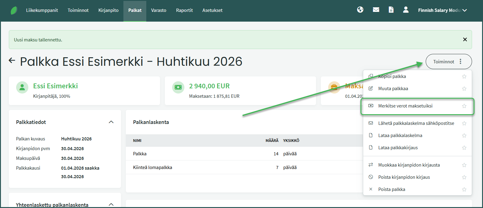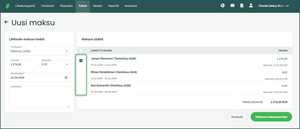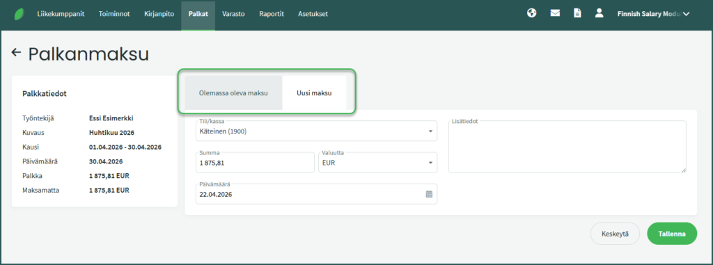Tässä ohjeessa kerrotaan, miten maksat palkan ja työnantajamaksut suoraan ohjelmasta tai lisäät maksun manuaalisesti.