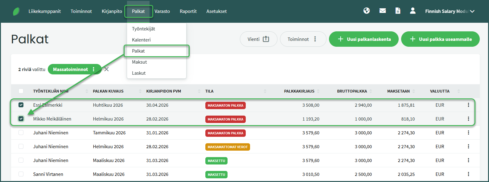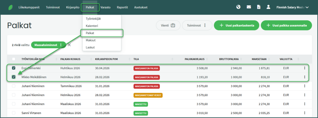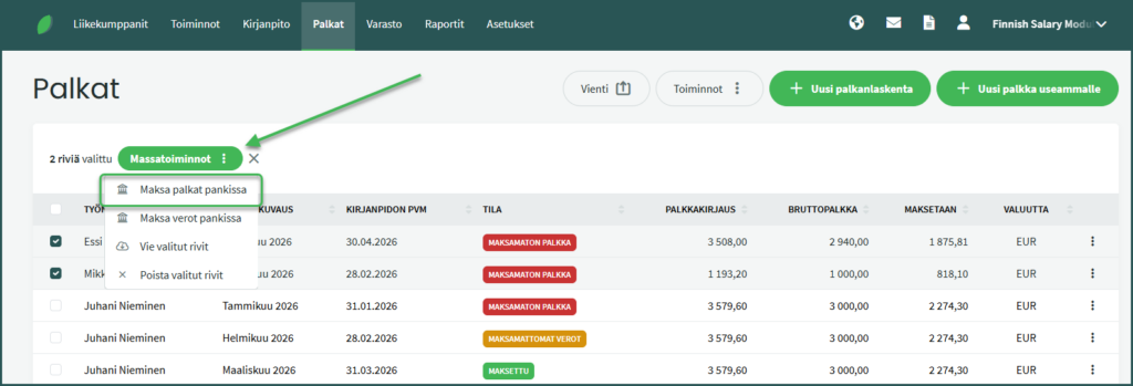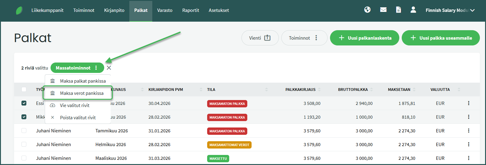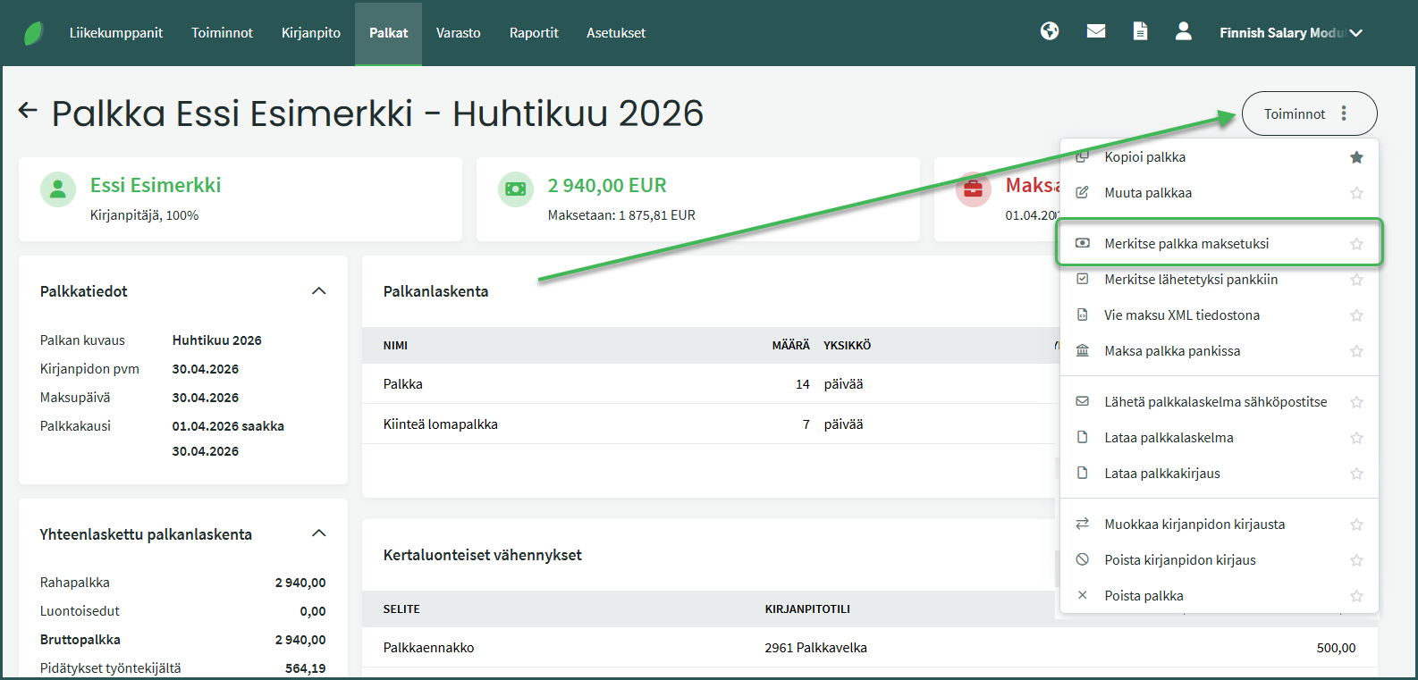 Tässä ohjeessa kerrotaan, miten maksat palkan ja työnantajamaksut suoraan ohjelmasta tai lisäät maksun manuaalisesti.