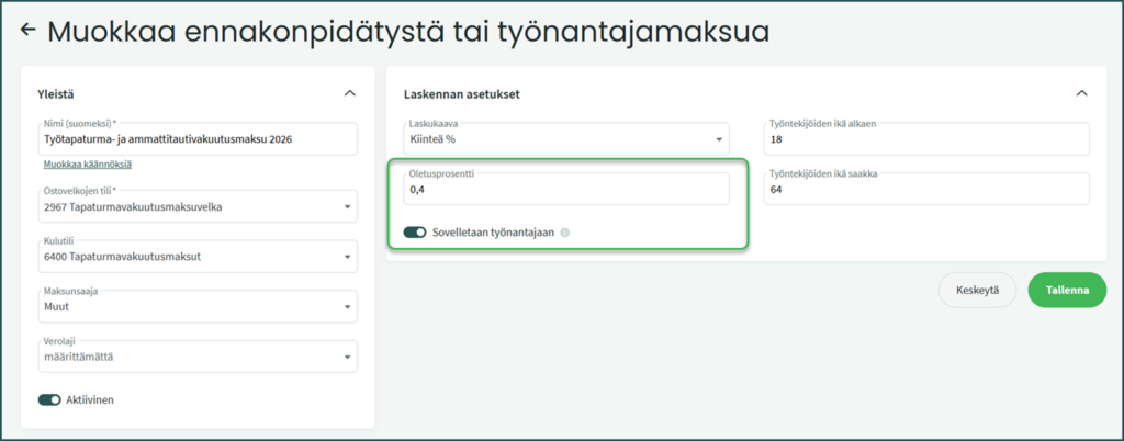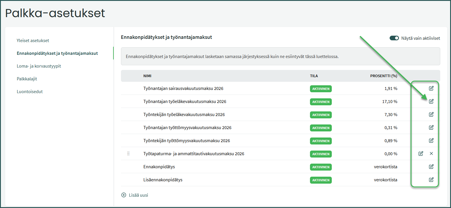 Pääset muokkaamaan tietoa rivin oikeassa reunassa olevasta kynäkuvakkeesta . Lisää oikea prosentti kenttään Oletusprosentti, tarkista että Sovelletaan työnantajaan -valinta on aktiivinen ja tallenna muutokset.