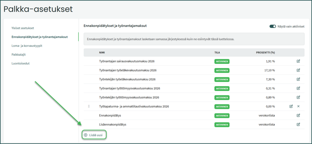 - Jos lisäät työntekijältä vähennettävän vakuutusmaksun, esim. työntekijän TyEL-maksun, painike ei saa olla aktiivinen.