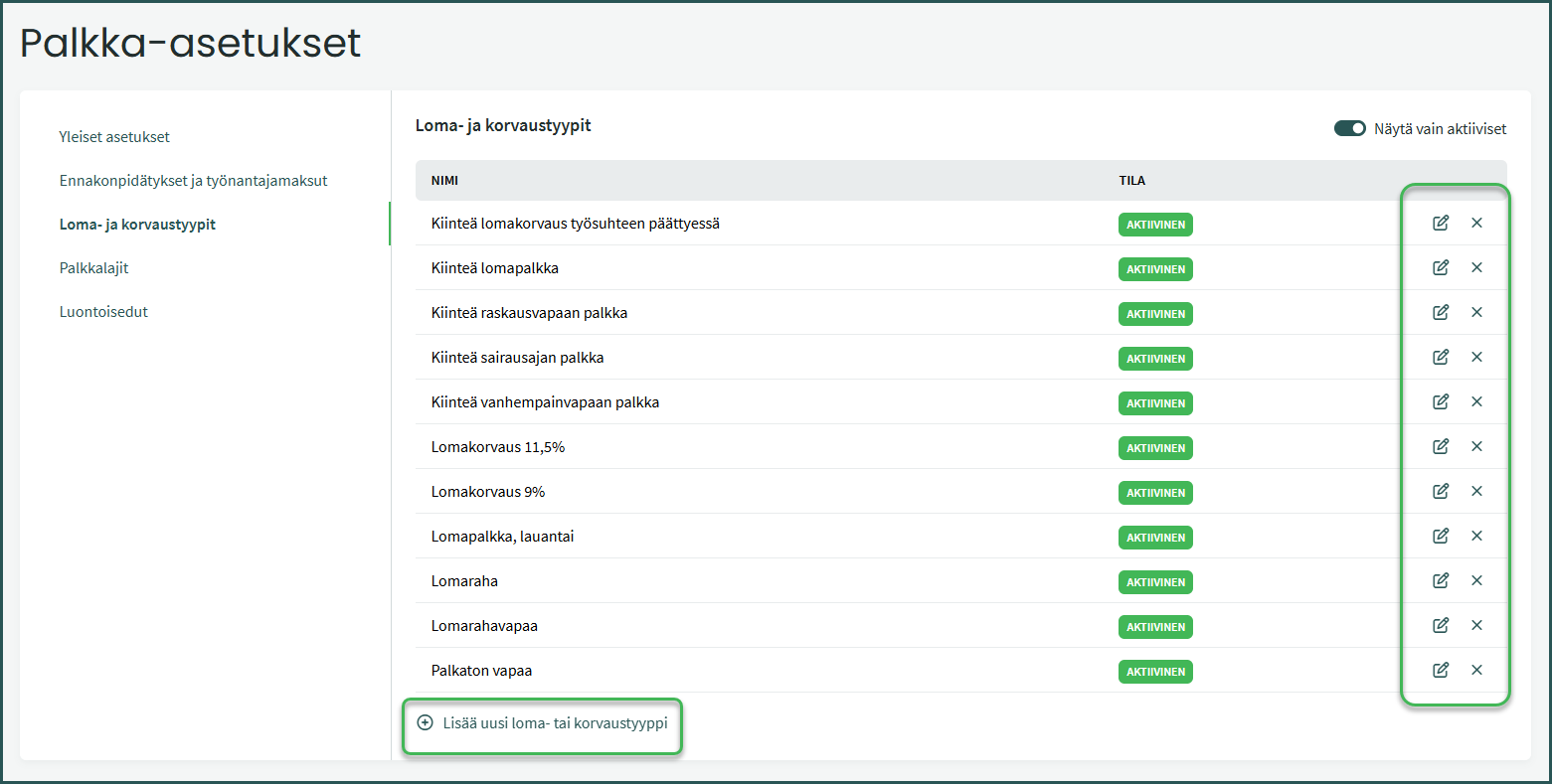 - Aktiivinen – Kun valinta on päällä, loma- tai korvaustyyppi on käytettävissä palkanlaskennassa.