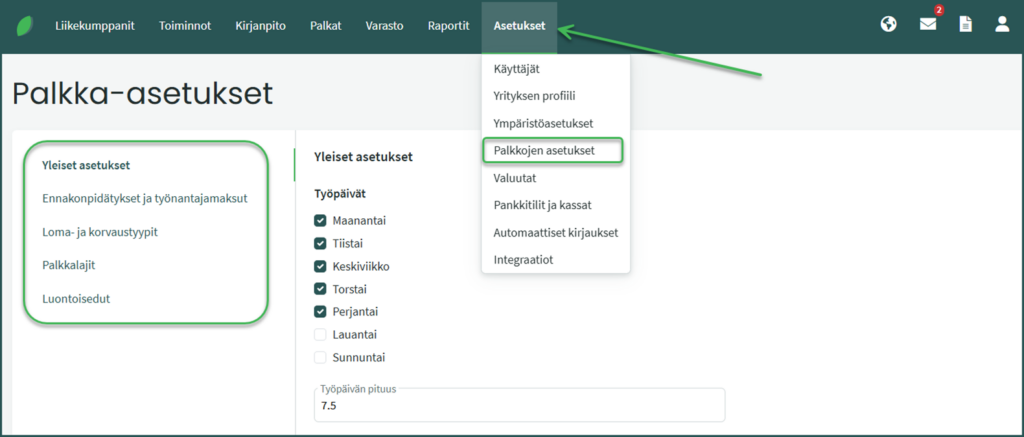 - Työpäivän asetukset