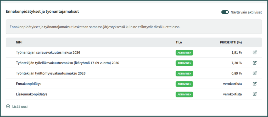 Kohdassa Ennakonpidätykset ja työnantajamaksut voit muokata olemassa olevia vakuutusmaksuja tai lisätä uusia. Oletuksena ohjelmaan on lisätty: