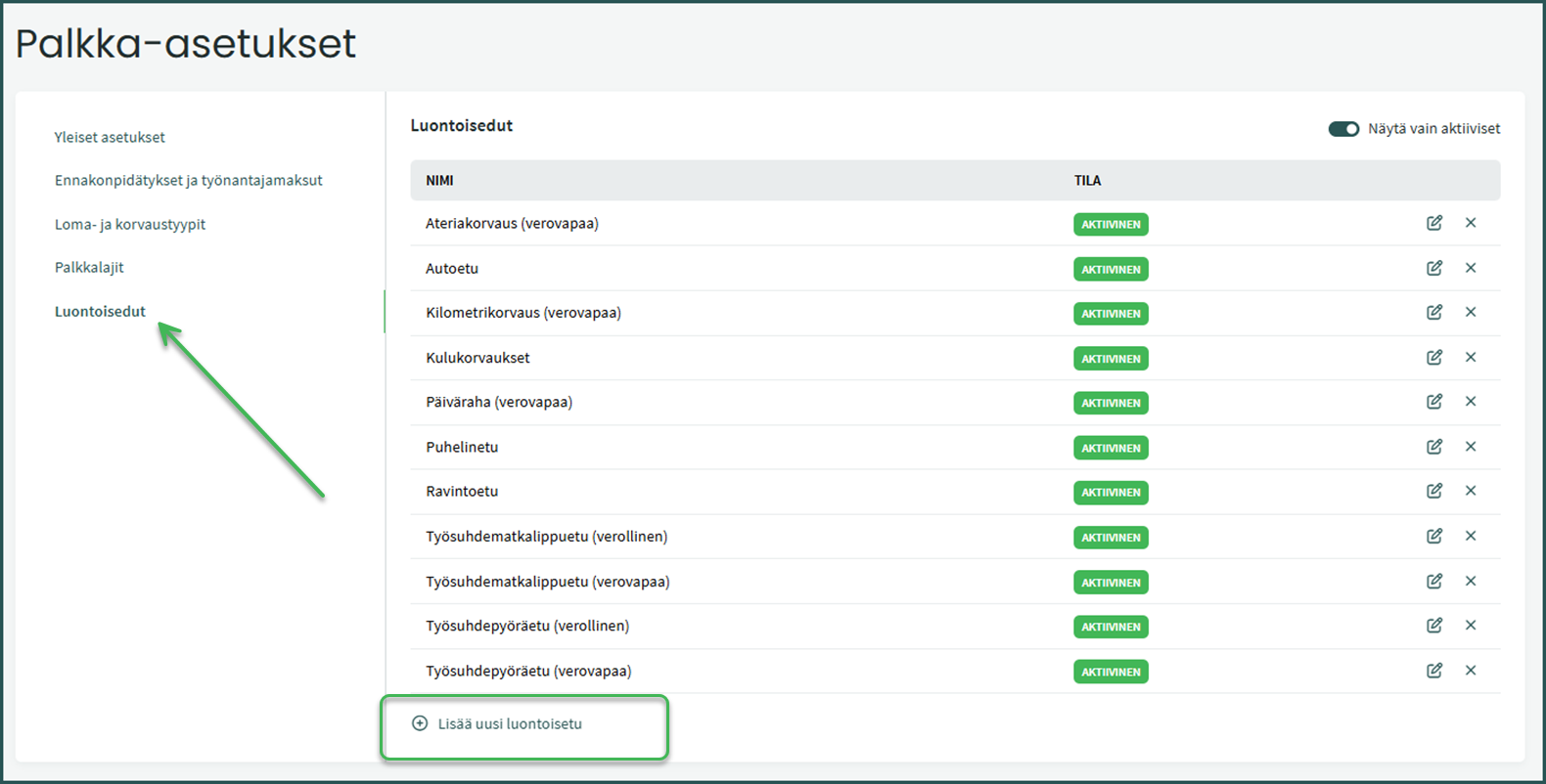 Pääset muokkaamaan luontoisetuja rivin oikeassa reunassa olevasta kynän kuvasta tai poistamaan ruksista. Uuden luontoisedun voit lisätä kohdasta ”Lisää uusi luontoisetu”. Voit myös merkitä luontoisedun passiiviseksi muokkaamalla haluamaasi luontoisetua ja laittamalla aktiivinen -painikkeen pois päältä.