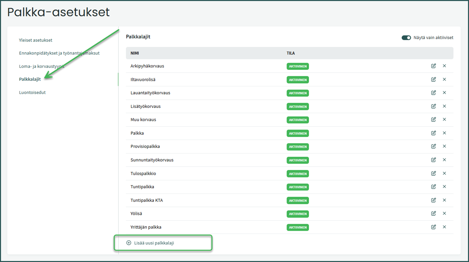 Pääset muokkaamaan palkkalajeja rivin oikeassa reunassa olevasta kynän kuvasta tai poistamaan ruksista. Uuden palkkalajin voit lisätä kohdasta ”Lisää uusi palkkalaji”. Voit myös merkitä palkkalajin passiiviseksi muokkaamalla haluamaasi palkkalajia ja laittamalla aktiivinen -painikkeen pois päältä.