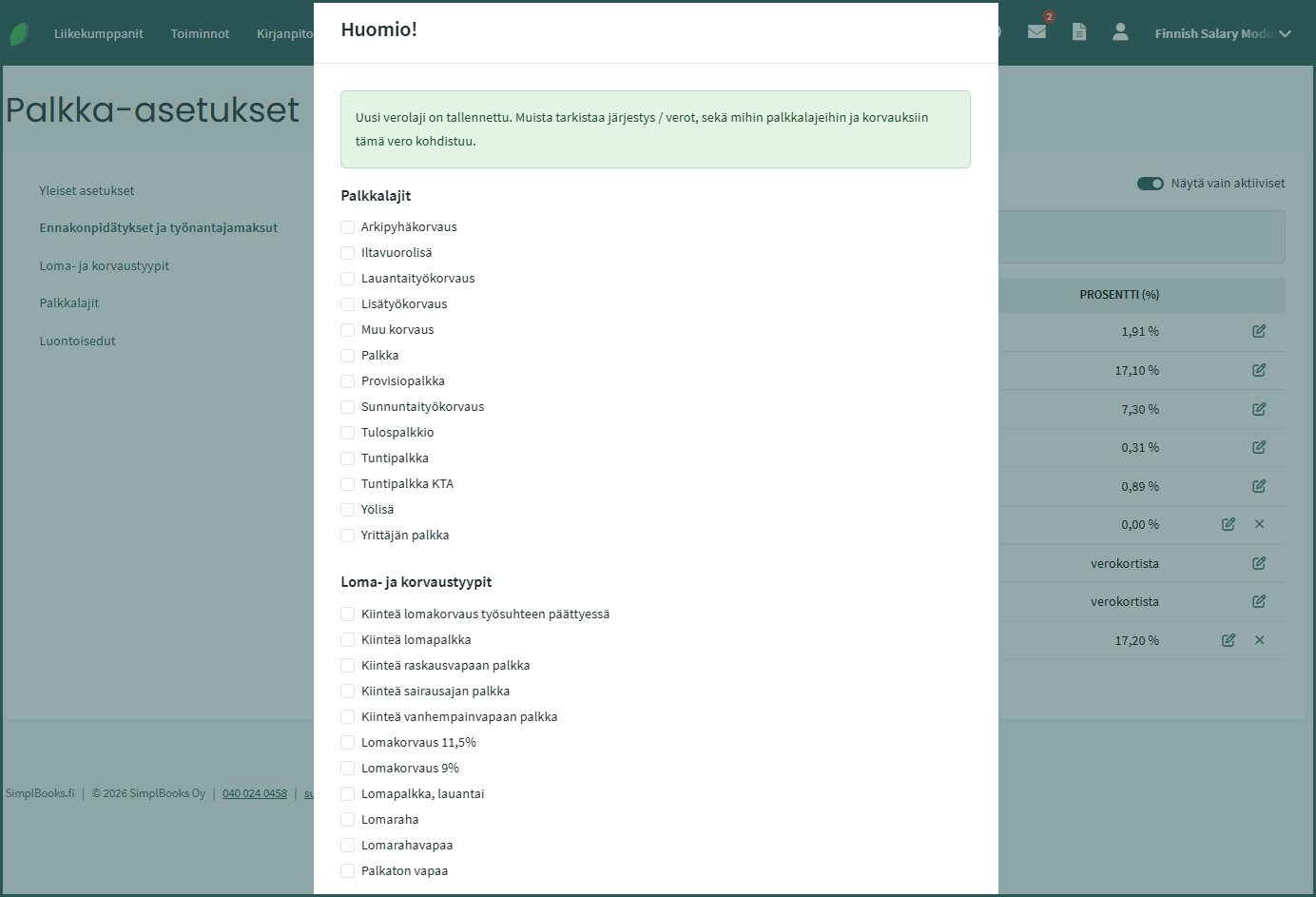 📢 Huom! Ennen palkanlaskennan aloittamista, tarkista palkanlaskennan alkuasetukset tämän ohjeen mukaan: Palkanlaskennan aloittaminen SimplBooksilla – SimplBooks Support.