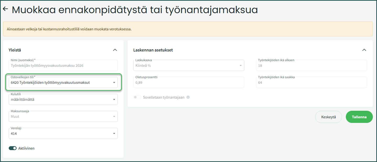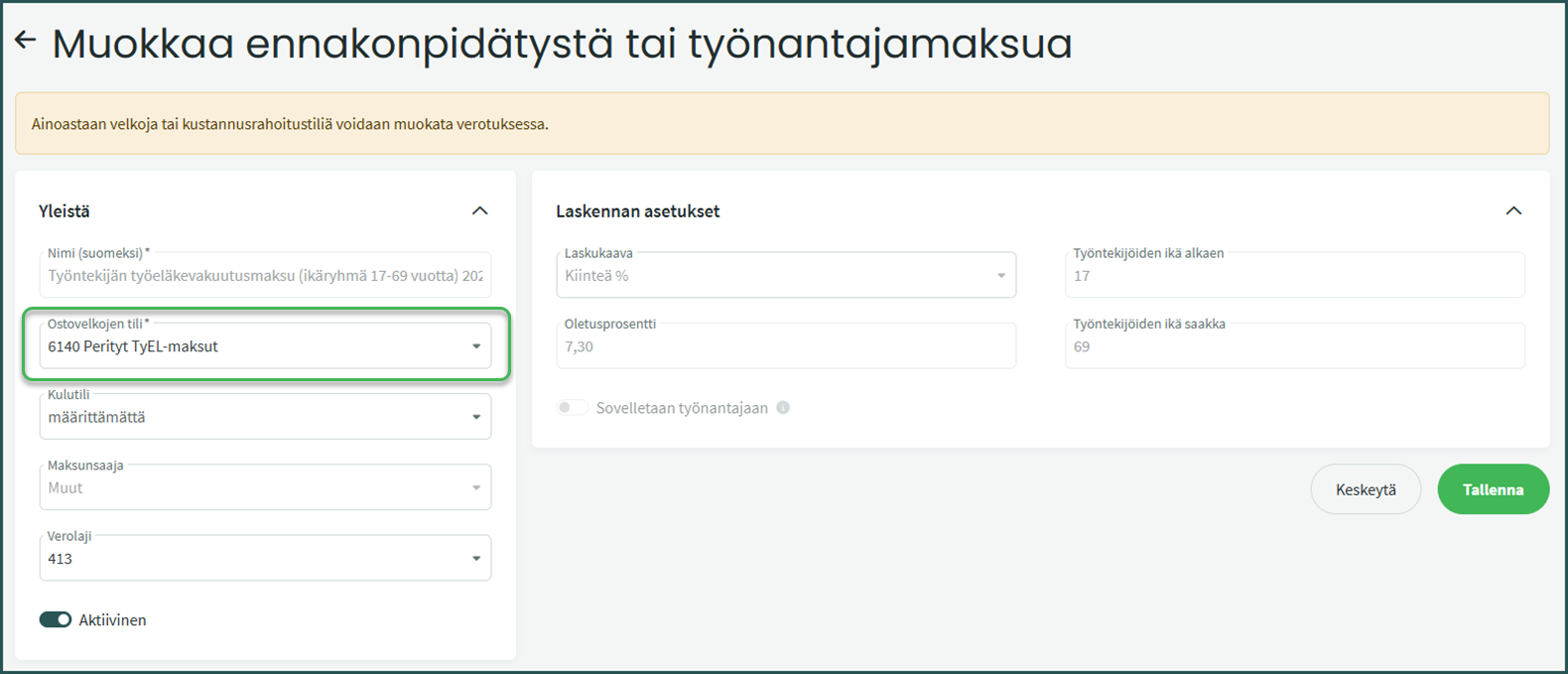 Muilla kuin työtapaturma- ja ammattitautivakuutusmaksulla voit muokata ainoastaan kirjanpidon tilejä sekä merkitä vakuutusmaksun aktiiviseksi tai passiiviseksi