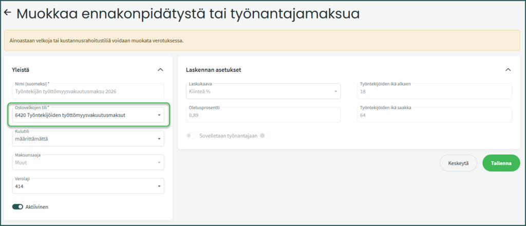 Tämän lisäksi muuta työntekijän työeläkevakuutusmaksun ja työntekijän työttömyysvakuutusmaksun ostovelkojen tiliksi tuloslaskelman tili. Oletuksena tilikartasta löytyy tilit 6140 Perityt TyEL-maksut ja 6420 Työntekijöiden työttömyysvakuutusmaksut.