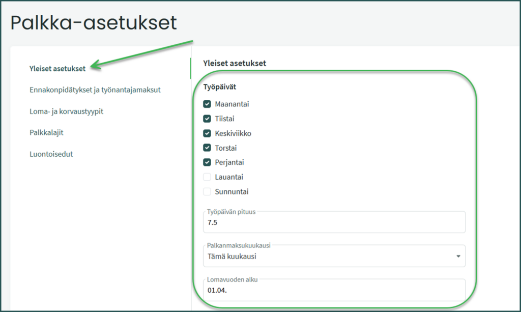 - Työpäivät – Tämä asetus vaikuttaa siihen, kuinka monelta päivältä palkat tuodaan automaattisesti palkanlaskentaan.