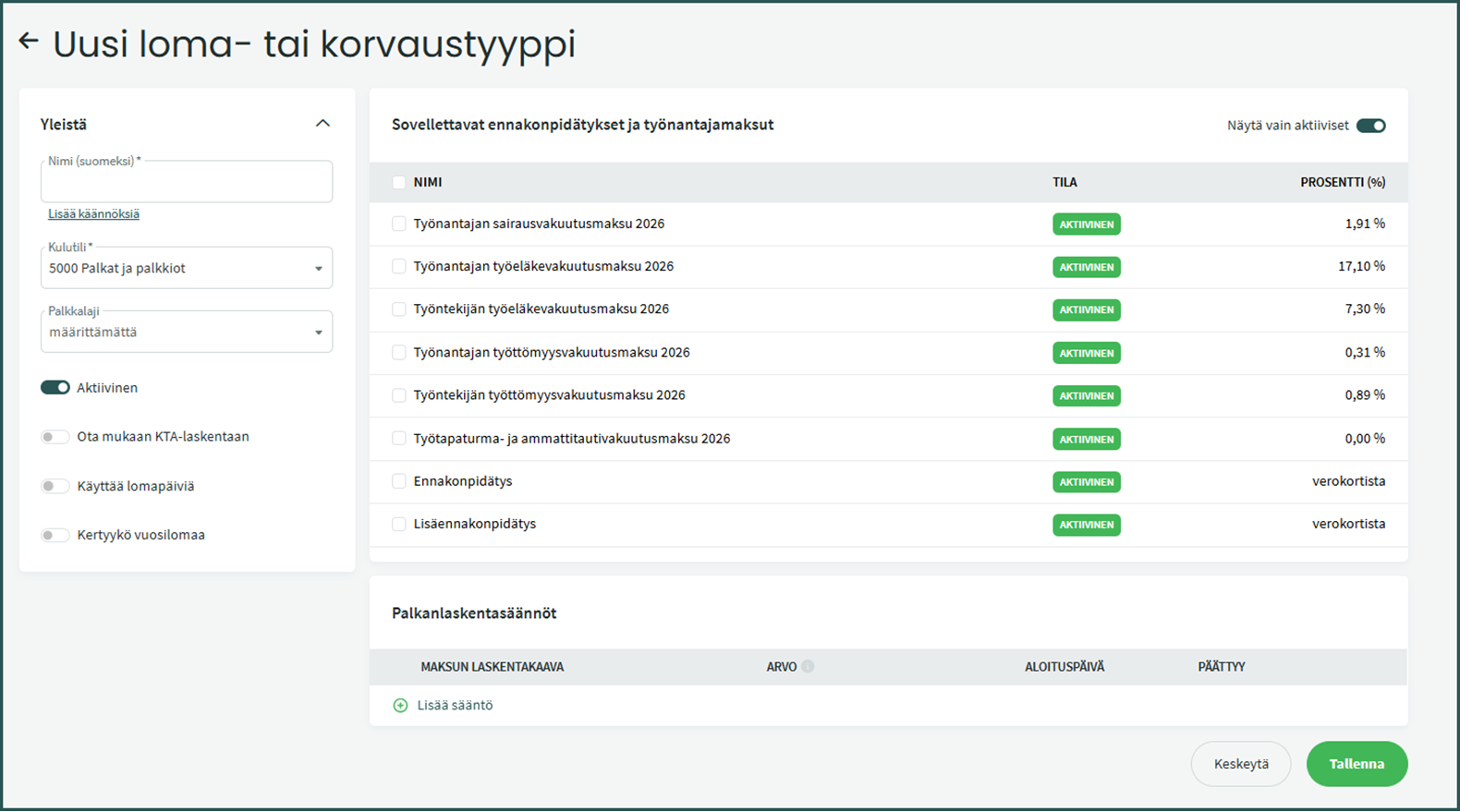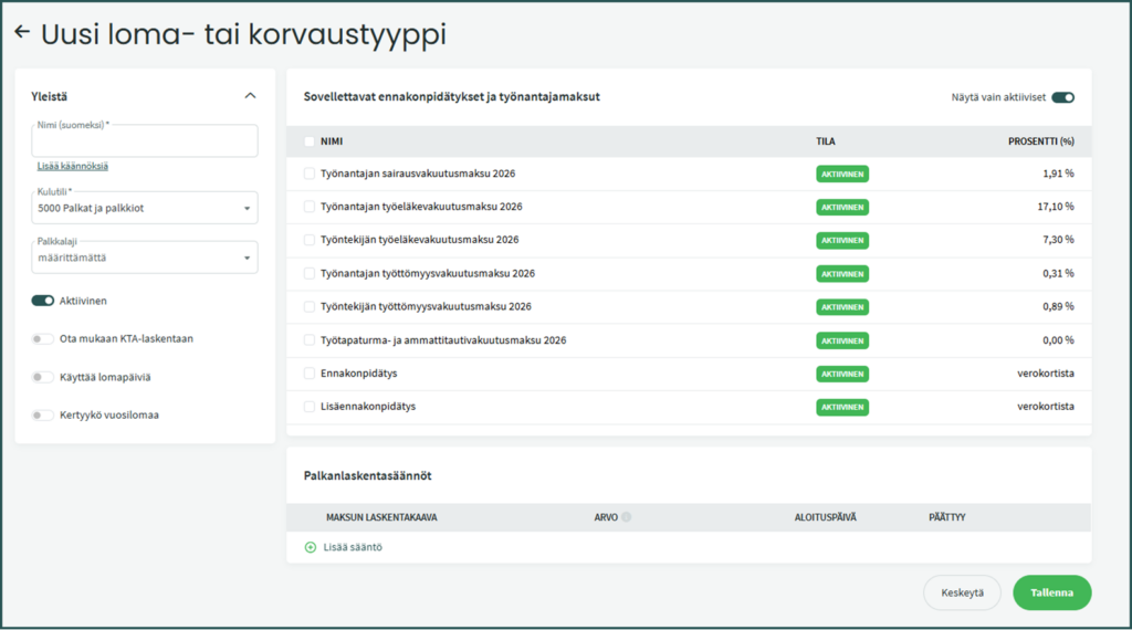 - Ota mukaan KTA-laskentaan – Kun valinta on päällä, loma- tai korvaustyyppi sisältyy palkkasummaan, jota käytetään KTA:n laskennassa.