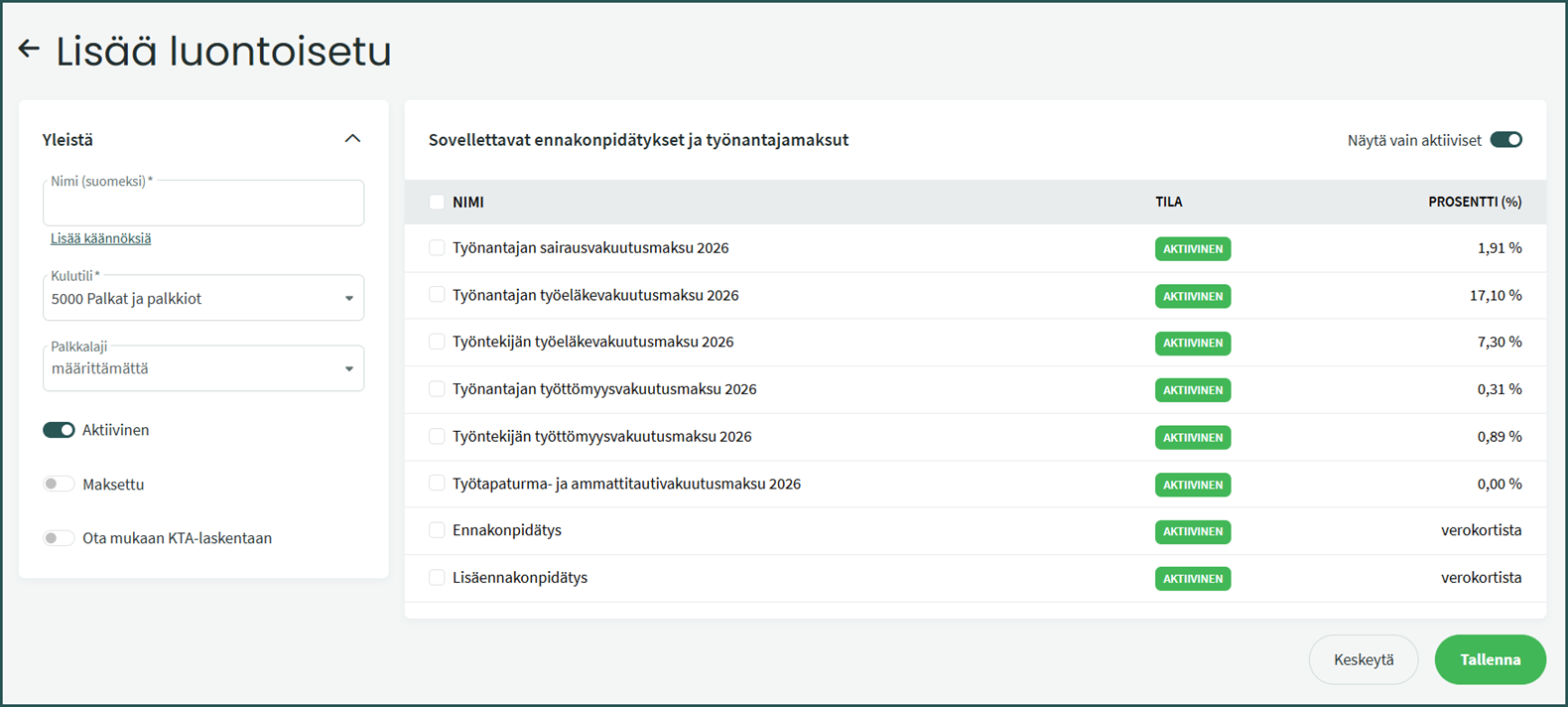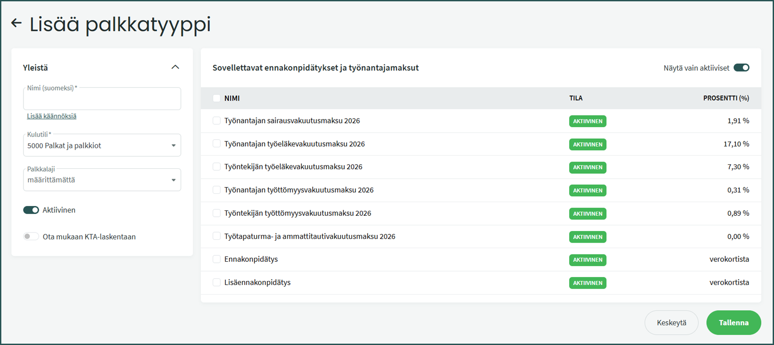 - Aktiivinen – Kun painike on päällä, palkkalaji on käytettävissä palkanlaskennassa.