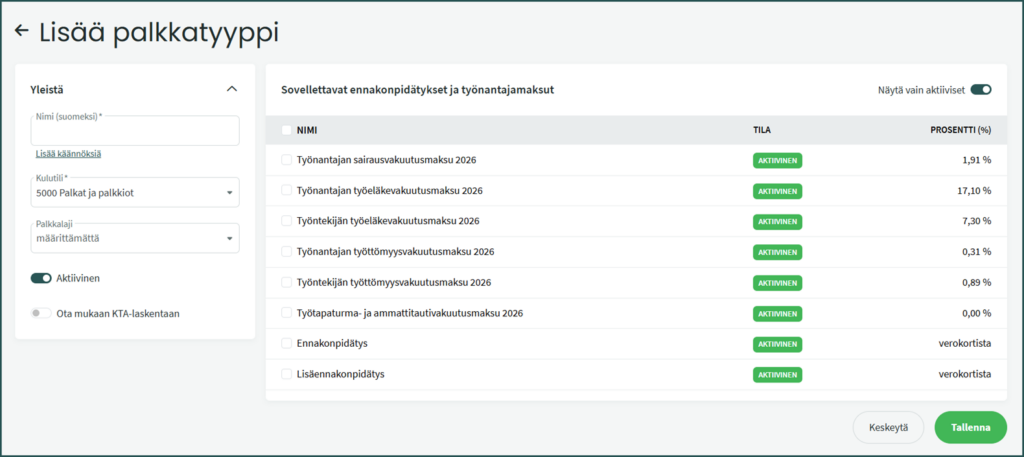 - Ota mukaan KTA-laskentaan – Kun painike on päällä, sisältyy palkkalaji palkkasummaan, jota käytetään KTA:n laskennassa. HUOM! KTA-laskenta ei ole vielä toiminnassa!