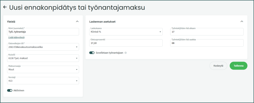 - Sovelletaan työnantajaan – Valinnan tulee olla aktiivinen, kun kyseessä on työnantajan maksama maksu.