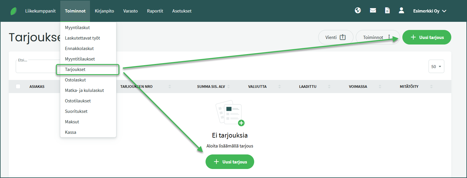 1. Voit tehdä tarjouksia kohdassa Toiminnot > Tarjoukset > Uusi tarjous.
