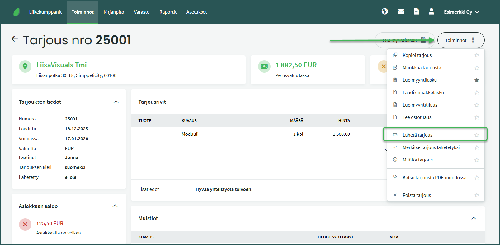 Tarjouksen tallentamisen jälkeen voit lähettää tarjouksen asiakkaalle kohdasta Toiminnot > Lähetä tarjous.