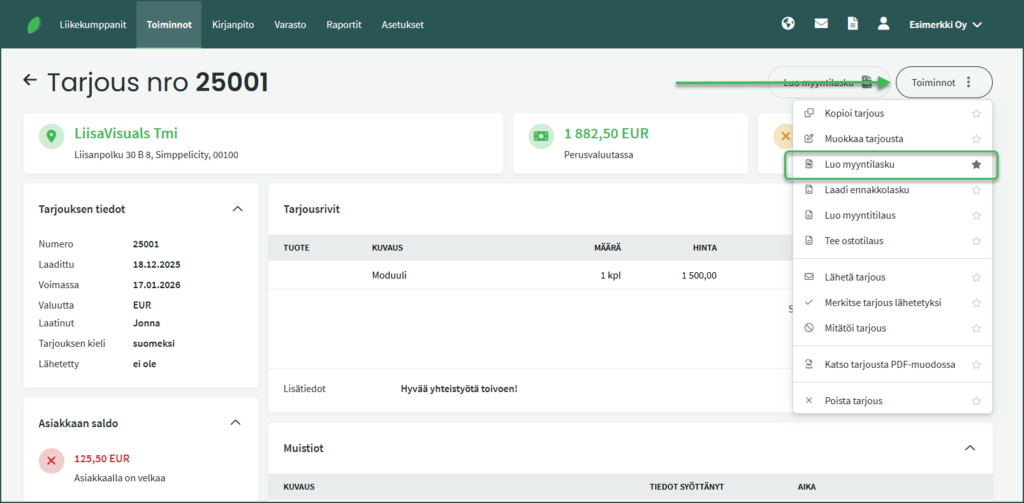 • Valitse tarjousnäkymässä oikeasta reunasta Toiminnot > Luo myyntilasku
