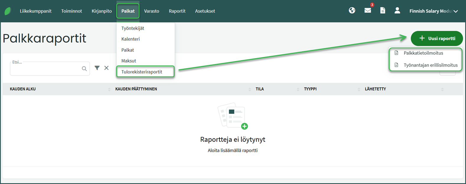 Tulorekisteriraportit löydät kohdasta Palkat > Tulorekisteriraportit. Lisää uusi raportti kohdasta ”Uusi raportti” ja valitse joko palkkatietoilmoitus tai työnantajan erillisilmoitus.