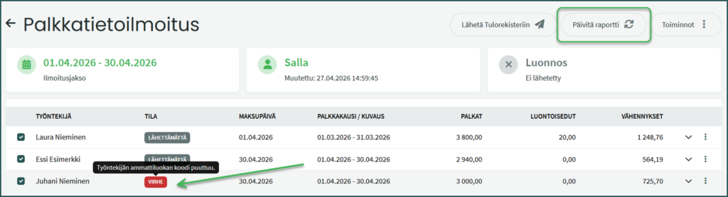 📢 Huom! Tulorekisteri-integraatio on vielä testausvaiheessa, mutta sen kautta voi jo lähettää palkkatietoilmoituksen ja työnantajan erillisilmoituksen. Jos käytät integraatiota, tarkista että ilmoitus on mennyt perille ja että ilmoituksen sisältö on oikein.