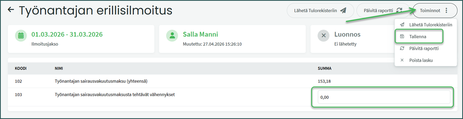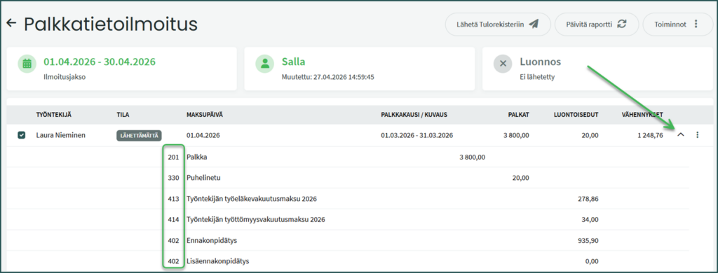 Raportin luomisen jälkeen voit joko täyttää ja lähettää ilmoituksen Tulorekisterin sähköisessä palvelussa tai lähettää ilmoituksen suoraan SimplBooksista integraation kautta.