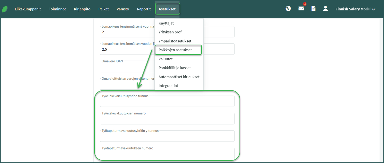 Jos olet säännöllinen työnantaja, lisää ennen raporttien muodostamista TyEL-vakuutuksen sopimusnumero ja tapaturmavakuutuksen sopimusnumero kohdassa Asetukset > Palkkojen asetukset > Yleiset asetukset.