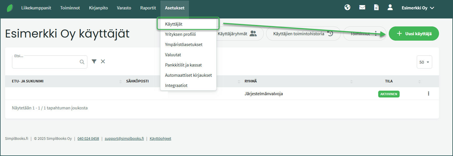 1. Lisää uusi käyttäjän kohdassa Asetukset > Käyttäjät > Uusi käyttäjä.