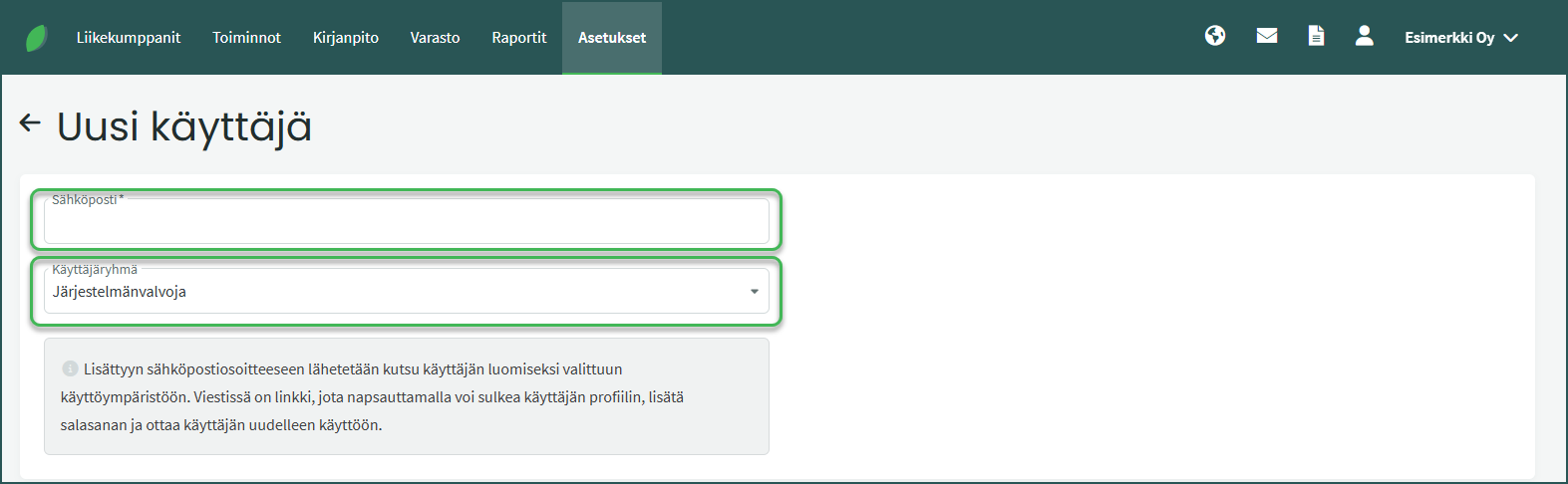 Osoite toimii käyttäjätunnuksena ja siihen lähetetään kutsu kun uusi käyttäjä tallennetaan. - Käyttäjäryhmä