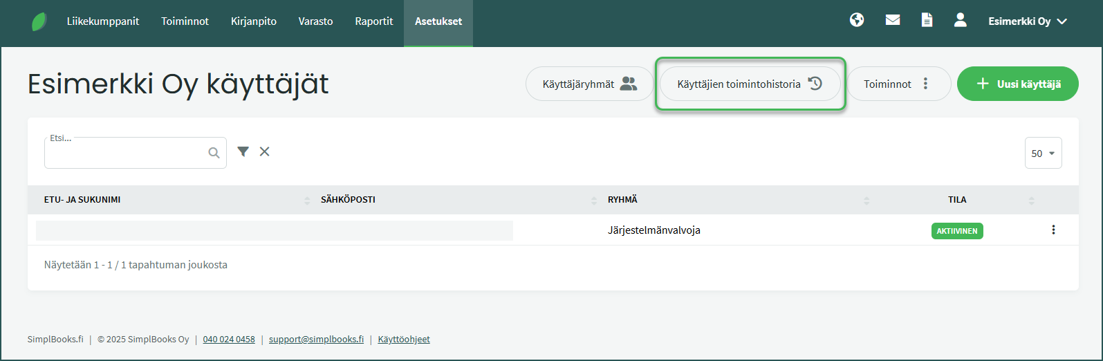 4. Käyttäjän toimintohistorian tarkastelu Voit tarkastella käyttäjien toimintohistoriaa ohjelman Käyttäjät-sivulta. Sivulta näet esimerkiksi lähetetyt ilmoitukset, tallennetut laskut ja muut käyttäjän tekemät toiminnot.