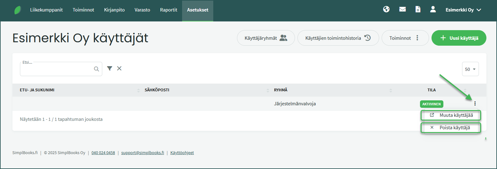 Käyttäjälistassa voit rivin lopussa olevasta valikosta muokata käyttäjän tietoja tai poistaa käyttäjän kokonaan. Muokkausnäkymästä voit myös aktivoida/deaktivoida käyttäjätunnuksen. Deaktivoitu käyttäjä ei voi kirjautua ohjelmaan.